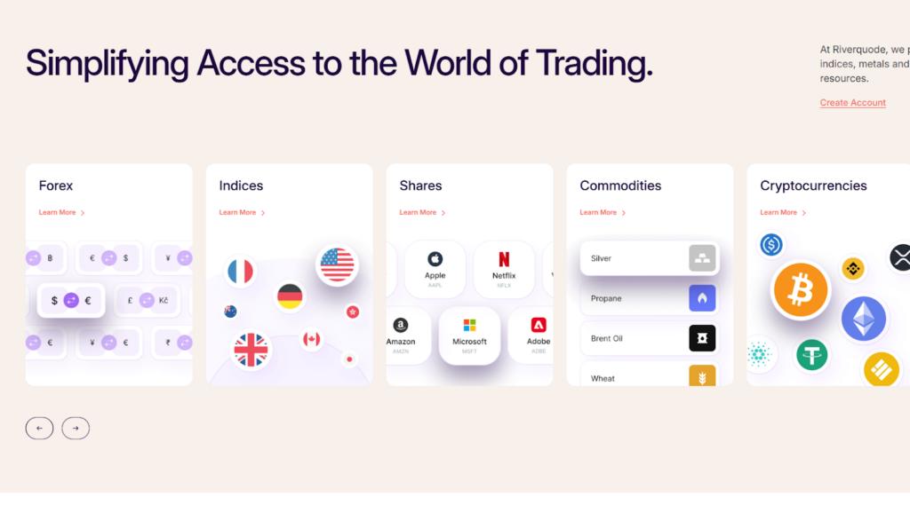Bei der Bewertung einer Riverquode review sollten Trader beachten, dass der Broker über 160 Handelsinstrumente in mehreren Anlageklassen anbietet – darunter forex, stocks, commodities, indices, metals und cryptocurrencies. Diese Vielfalt macht Riverquode forex trading attraktiv für Trader mit unterschiedlichen Strategien und Interessen.