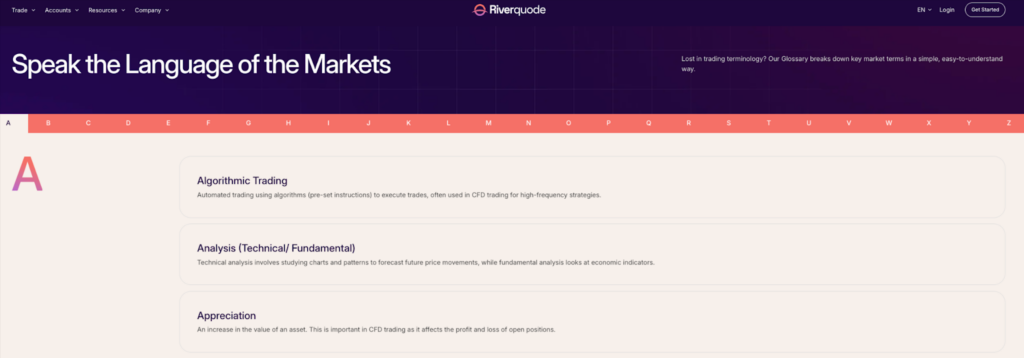 Le centre de formation de Riverquode est conçu pour les débutants et propose des leçons simplifiées, des livres numériques et un glossaire pour expliquer les concepts clés du Forex. Les nouveaux traders peuvent également bénéficier d’un accompagnement personnalisé via chat en direct et d’une assistance multilingue pour un apprentissage plus fluide et interactif.
